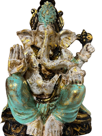 Descubre la magia y la espiritualidad de esta exquisita estatua de Ganesha, elaborada en resina con acabados dorados y detalles en color turquesa que irradian serenidad y buena energía. Ganesha, el dios hindú de la prosperidad y la eliminación de obstáculos, es ideal para atraer abundancia, armonía y equilibrio a cualquier espacio. Perfecta para decoraciones espirituales, altares personales o como un regalo significativo para aquellos que buscan buenas vibras y conexión espiritual. Su diseño detallado y acabado envejecido hacen de esta pieza un símbolo único de estilo y espiritualidad.