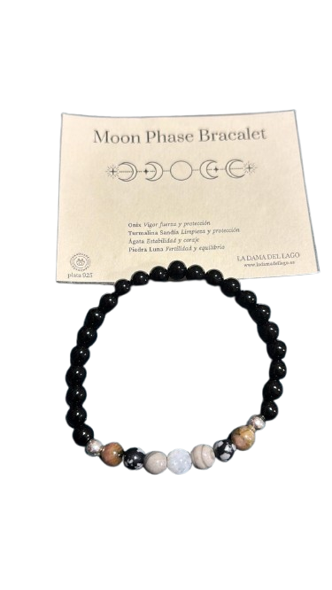 Conecta con la energía de la luna y el poder de las piedras naturales con esta hermosa pulsera de fases lunares. Elaborada con ónix para vigor y protección, turmalina para limpieza energética, ágata para estabilidad, y piedra luna para fertilidad y equilibrio, esta pieza combina diseño y significado espiritual. Perfecta para quienes buscan armonía, conexión con la naturaleza y un accesorio único. Los detalles en plata 925 le aportan un toque elegante, convirtiéndola en un regalo ideal o un complemento para tu estilo boho-espiritual.